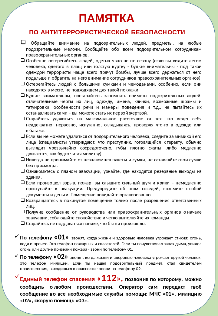 - Будьте внимательны к любым подозрительным действиям или объектам вокруг вас.