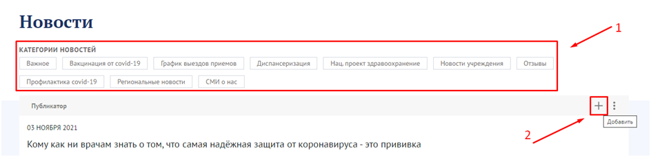 Добавление новостей осуществляется с помощью преднастроенного публикатора (рисунок 14). Чтобы добавить новость выберите одну из категорий новости (1), нажмите на плюс и выберите «Универсальная новость» (2)(рисунок 14). ВНИМАНИЕ! Для того, чтобы отобразить новость как Важную на главной странице, выберите категорию «Важное».