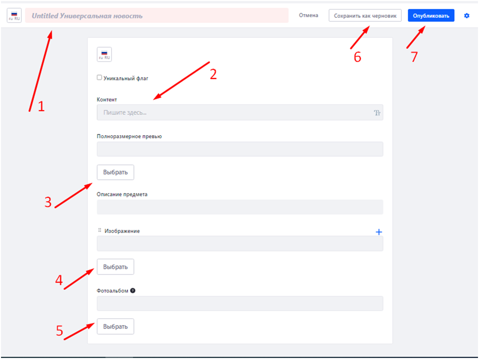 Введите заголовок новости в поле Универсальная новость (1), текст новости в поле Контент (2). При наличии выберите полноразмерное превью, нажав кнопку Выбрать (3), при необходимости добавьте Изображение, также по соответствующей кнопке Выбрать (4). Добавьте еще поля для новых Изображений, нажав на плюс напротив текущего Изображения. В случае большого количества фотографий воспользуйтесь Фотоальбомом (5).