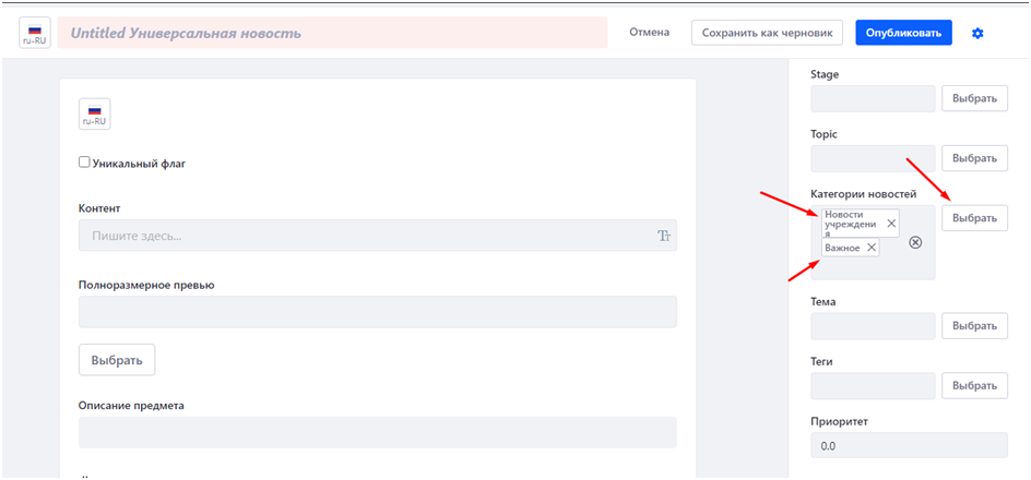 При необходимости добавьте дополнительные категории для новости, нажав кнопку Выбрать в блоке Категории новостей (рисунок 16).